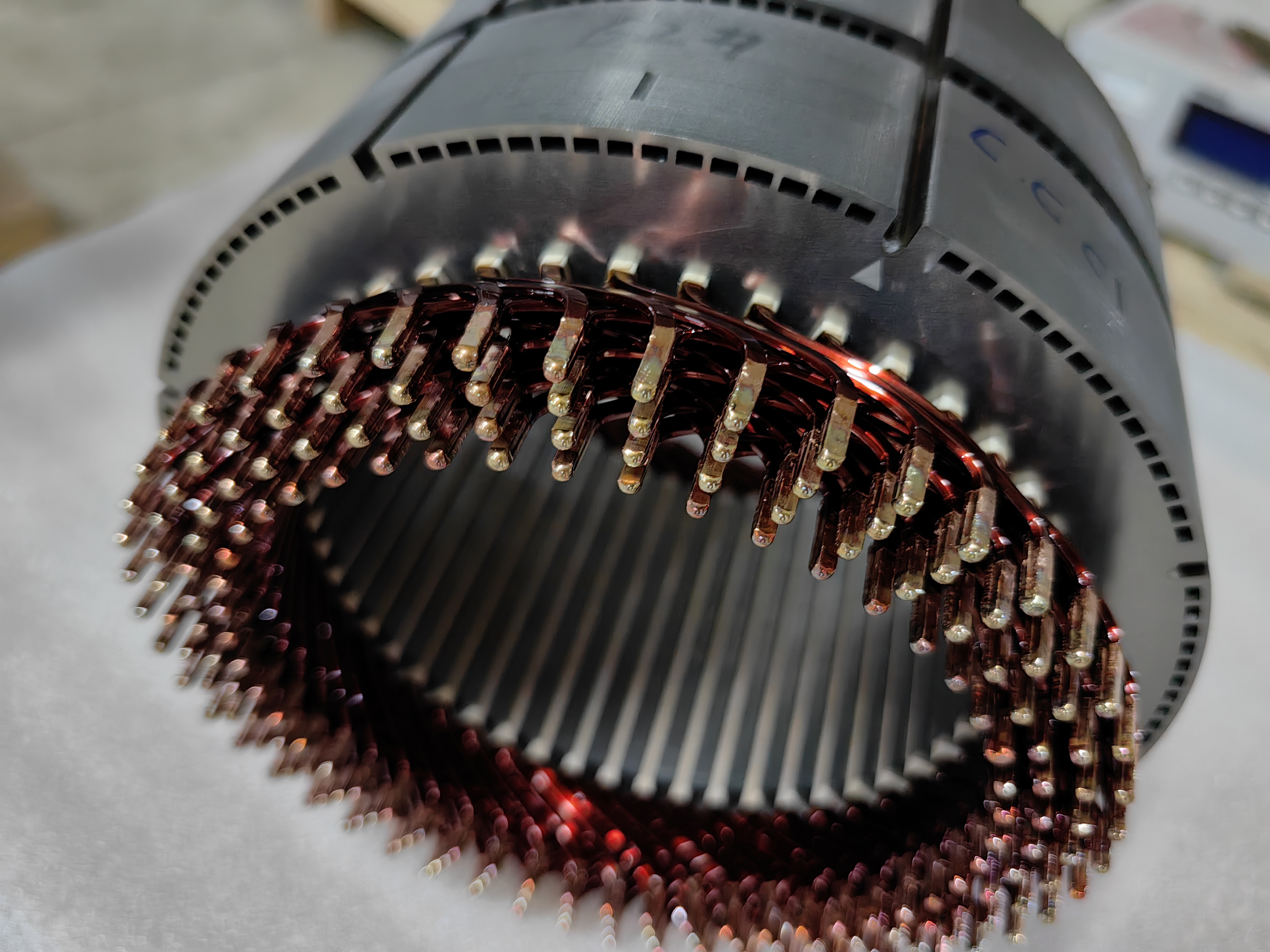 (1)鐵芯上絕緣紙(B形、S形、O型)→(2)漆包扁線下線去漆成U型→(3)異形線定長下線去漆→(4)異形線成型→(5)星點線焊接→(6)人工預(yù)插線入定子鐵芯→(7)線圈整形壓入鐵芯→(8)非出線端自動伺服扭頭并自動消除回彈角→(9)非出線端線頭自動切平→(10)非出線端自動TIG焊接→(11)三相引出線焊接。